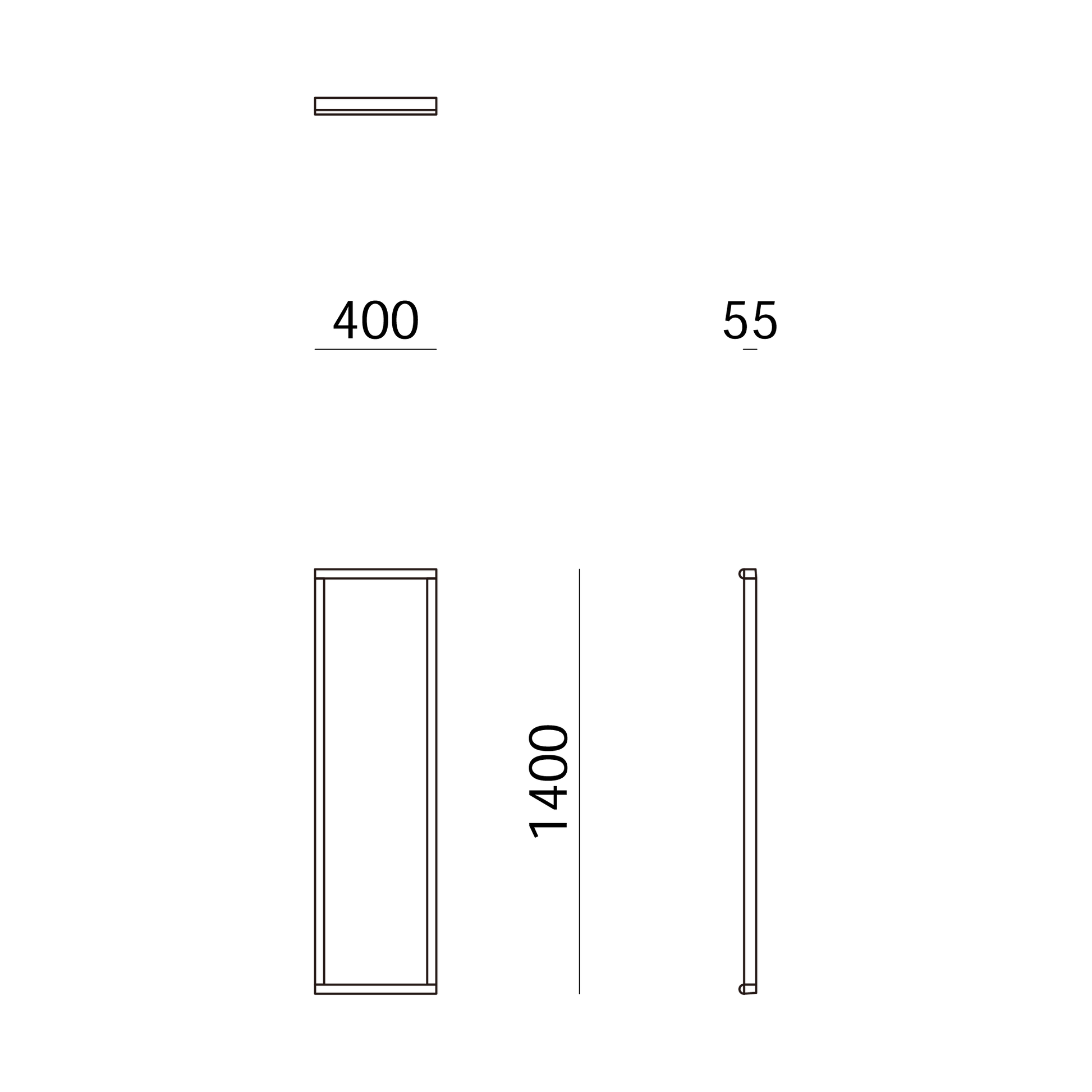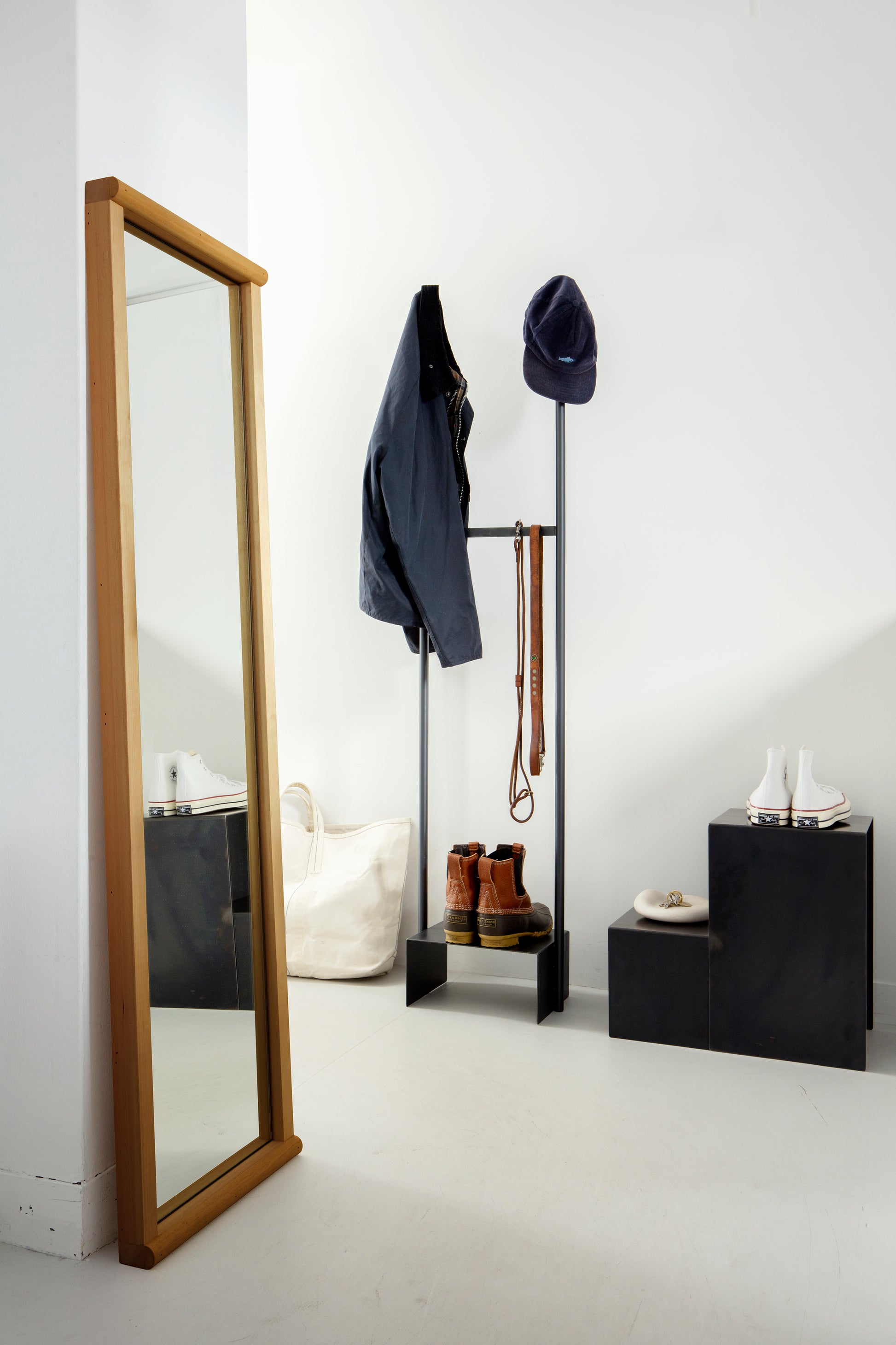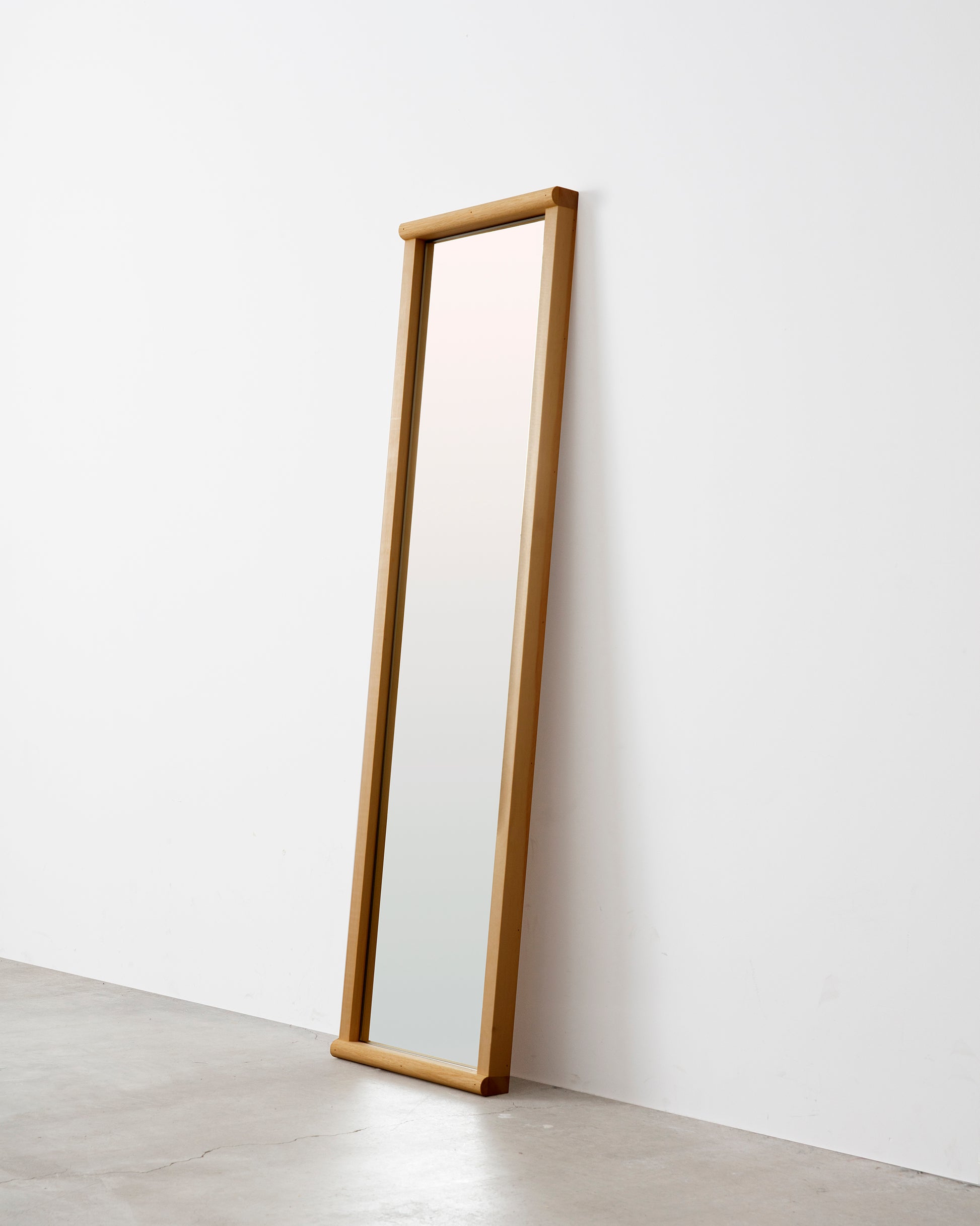 シリーズのシェルフと同じく、質素な素材に挟まれた、中身を主役に見立てたミラーです。床に置き、壁に立てかけて使用できるよう、上下に4度の傾斜が設けられています。